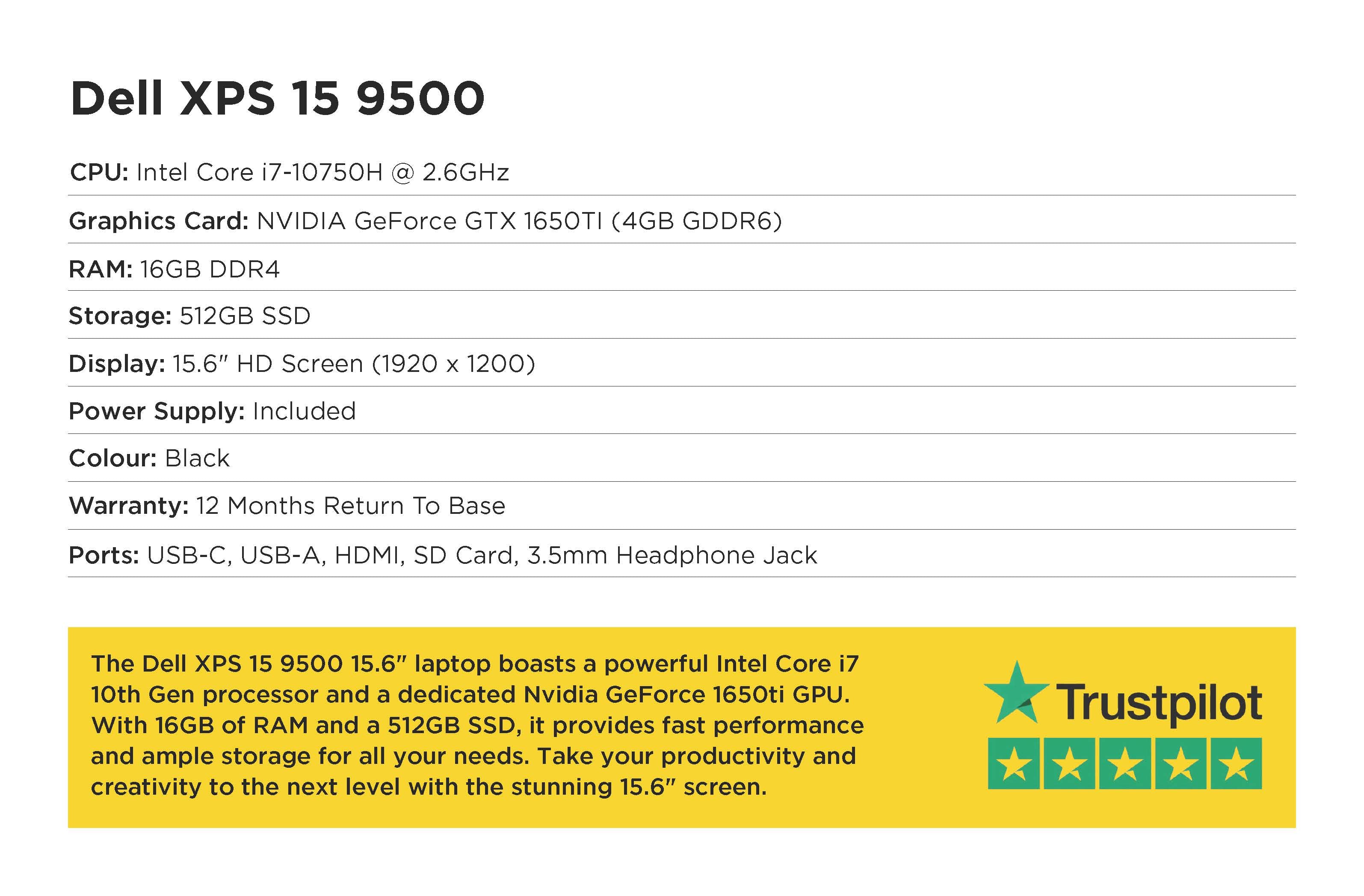 The Dell XPS 15 9500 15.6" laptop boasts a powerful Intel Core i7 10th Gen processor and a dedicated Nvidia GeForce 1650ti GPU. With 16GB of RAM and a 512GB SSD, it provides fast performance and ample storage for all your needs. Take your productivity and creativity to the next level with the stunning 15.6" screen.