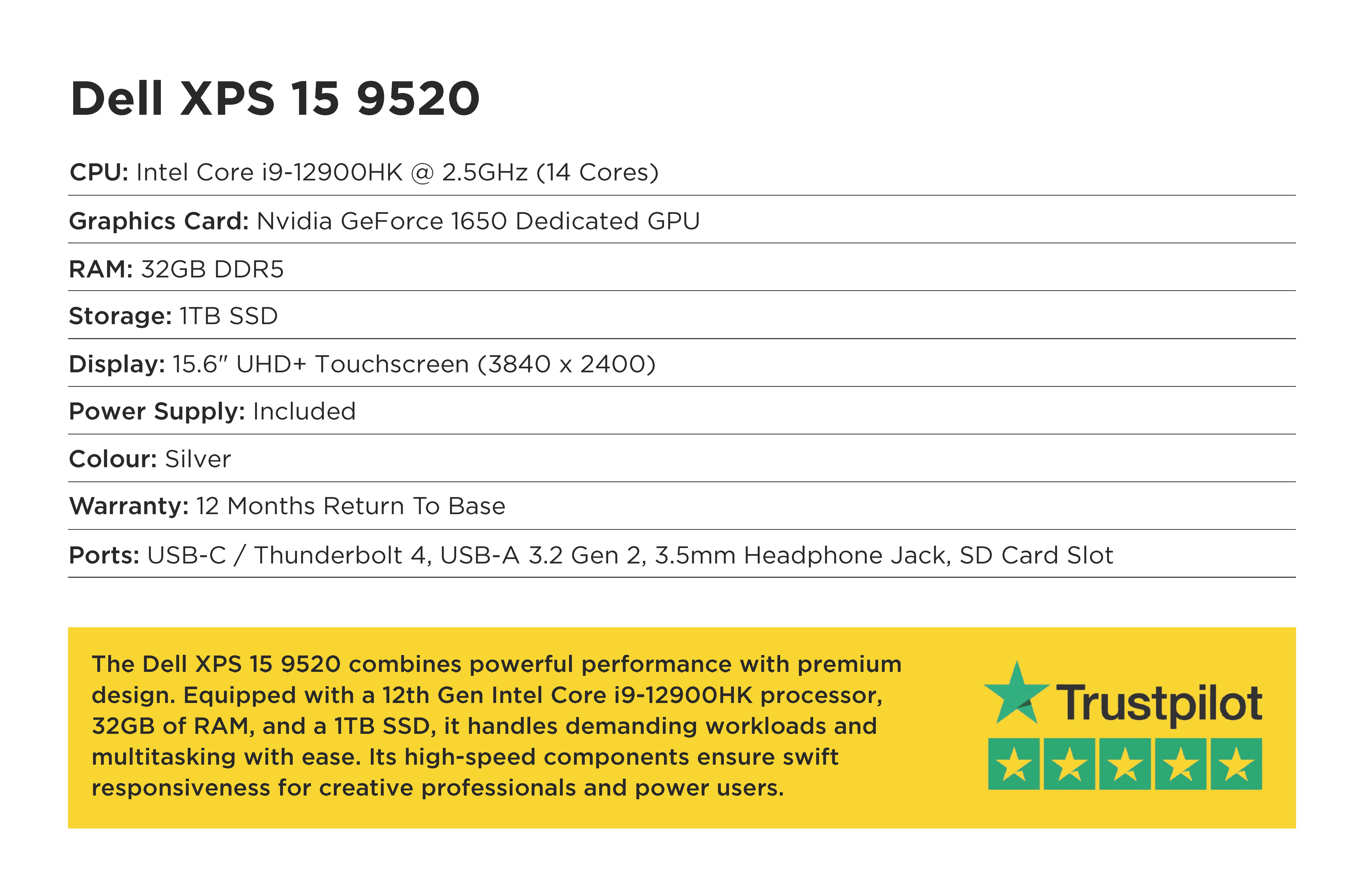 The Dell XPS 15 9520 combines powerful performance with premium design. Equipped with a 12th Gen Intel Core i9-12900HK processor, 32GB of RAM, and a 1TB SSD, it handles demanding workloads and multitasking with ease. Its high-speed components ensure swift responsiveness for creative professionals and power users. This laptop offers a seamless balance of speed, storage, and reliability, ideal for intensive applications and large projects.
