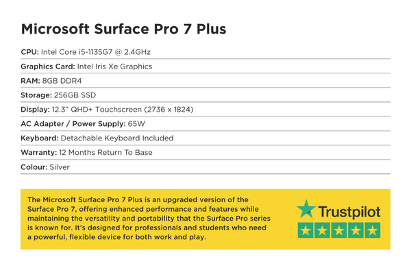 The Microsoft Surface Pro 7+ is an upgraded version of the Surface Pro 7, offering enhanced performance and features while maintaining the versatility and portability that the Surface Pro series is known for. It’s designed for professionals and students who need a powerful, flexible device for both work and play.