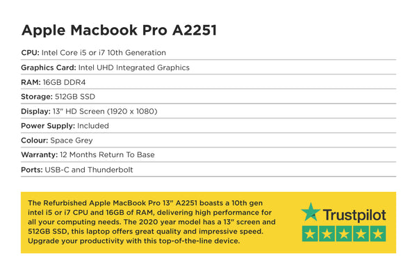 The Refurbished Apple MacBook Pro 13" A2251 boasts a 10th gen intel i5 or i7 CPU and 16GB of RAM, delivering high performance for all your computing needs. The 2020 year model has a 13" screen and 512GB SSD, this laptop offers great quality and impressive speed. Upgrade your productivity with this top-of-the-line device.