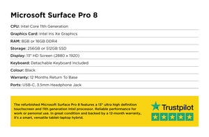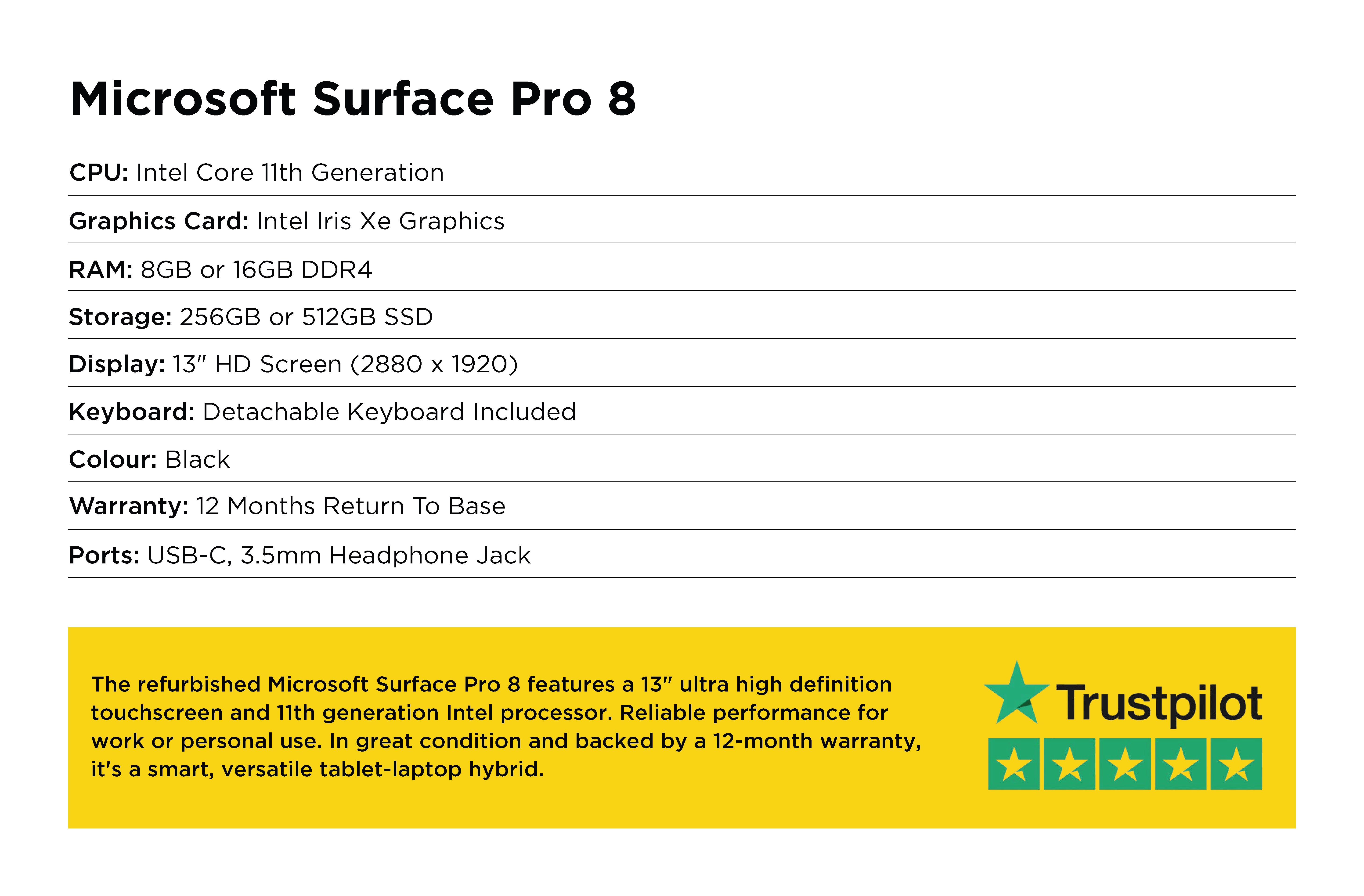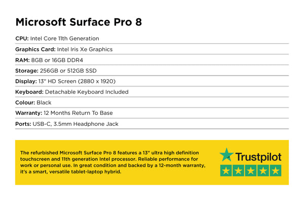 The refurbished Microsoft Surface Pro 8 features a 13" ultra high definition touchscreen and 11th generation Intel processor. Reliable performance for work or personal use. In great condition and backed by a 12-month warranty, it's a smart, versatile tablet-laptop hybrid.